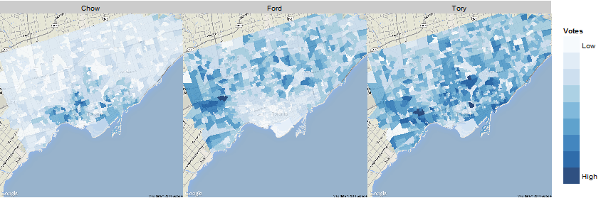 Our analytical approach allows us to take a closer, geographical look. Based on this, we see general support for Tory across the city, while Ford and Chow have more distinct areas of support.