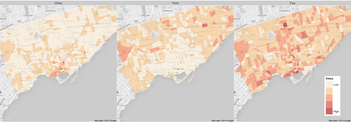 Our final predictions have John Tory winning the 2014 mayoral election in Toronto with a plurality 46% of the votes, followed by Doug Ford (29%) and Olivia Chow (25%). We also predict turnout of at least 49% across the city, but there are differences in turnout among each candidate’s supporters (with Tory’s supporters being the most likely to vote by a significant margin - which is why our results are more in his favour than recent polls). We predict support for each candidate will come from different pockets of the city, as can be seen on the map below.