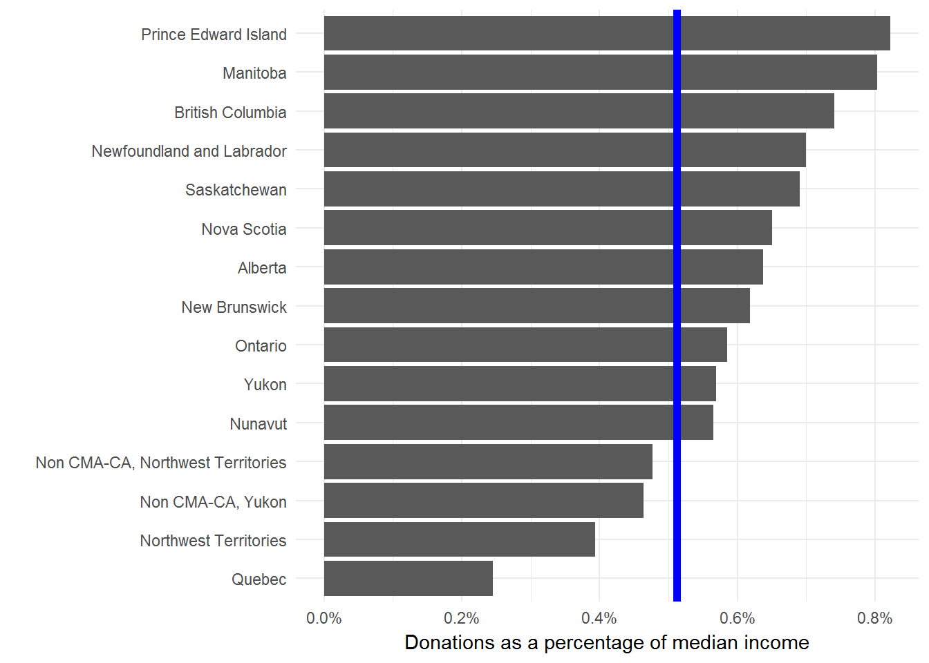 I’m not comfortable with using median donations (adjusted for income or not) to say anything in particular about the residents of a province. But, I’m always happy to look more closely at data and provide some context for public debates.